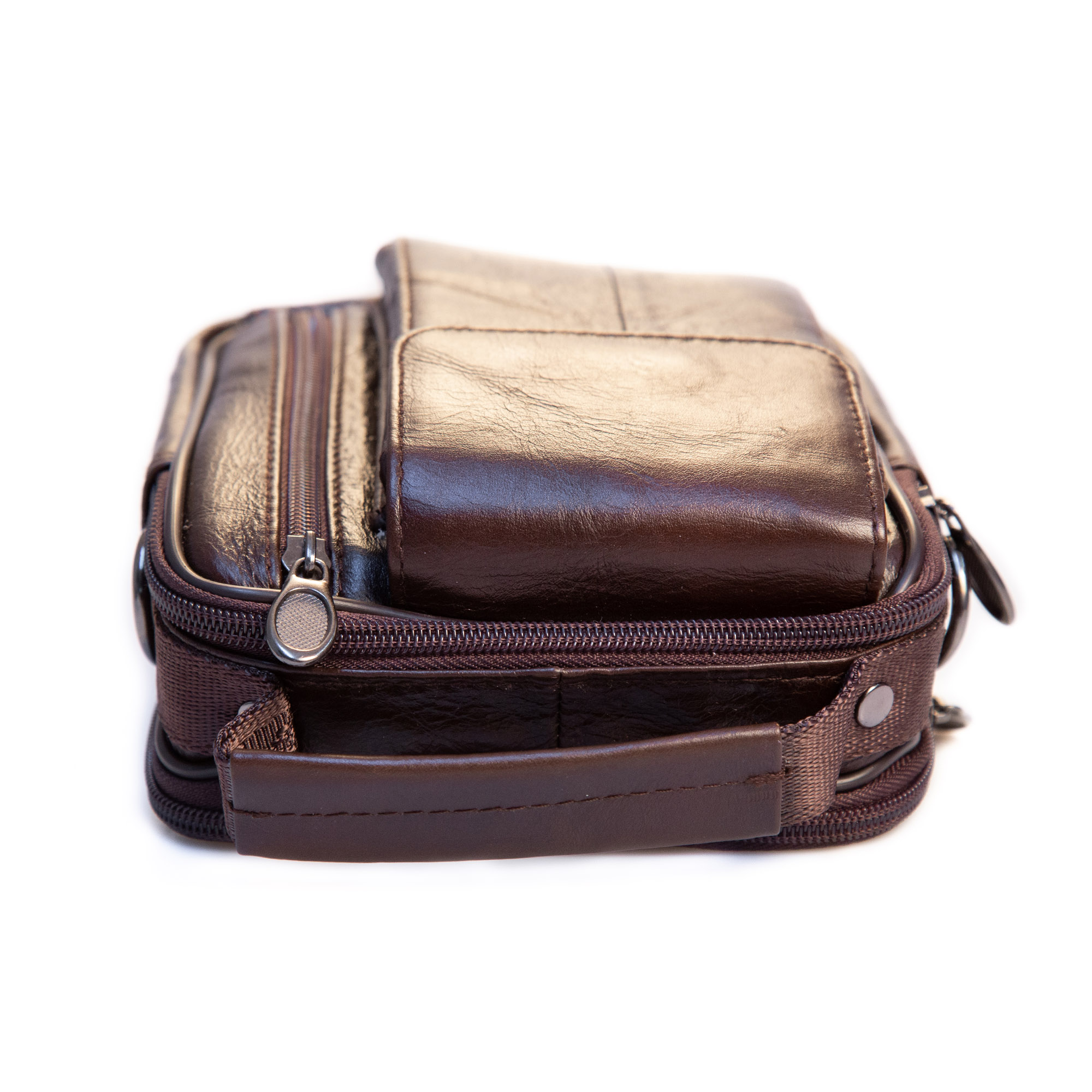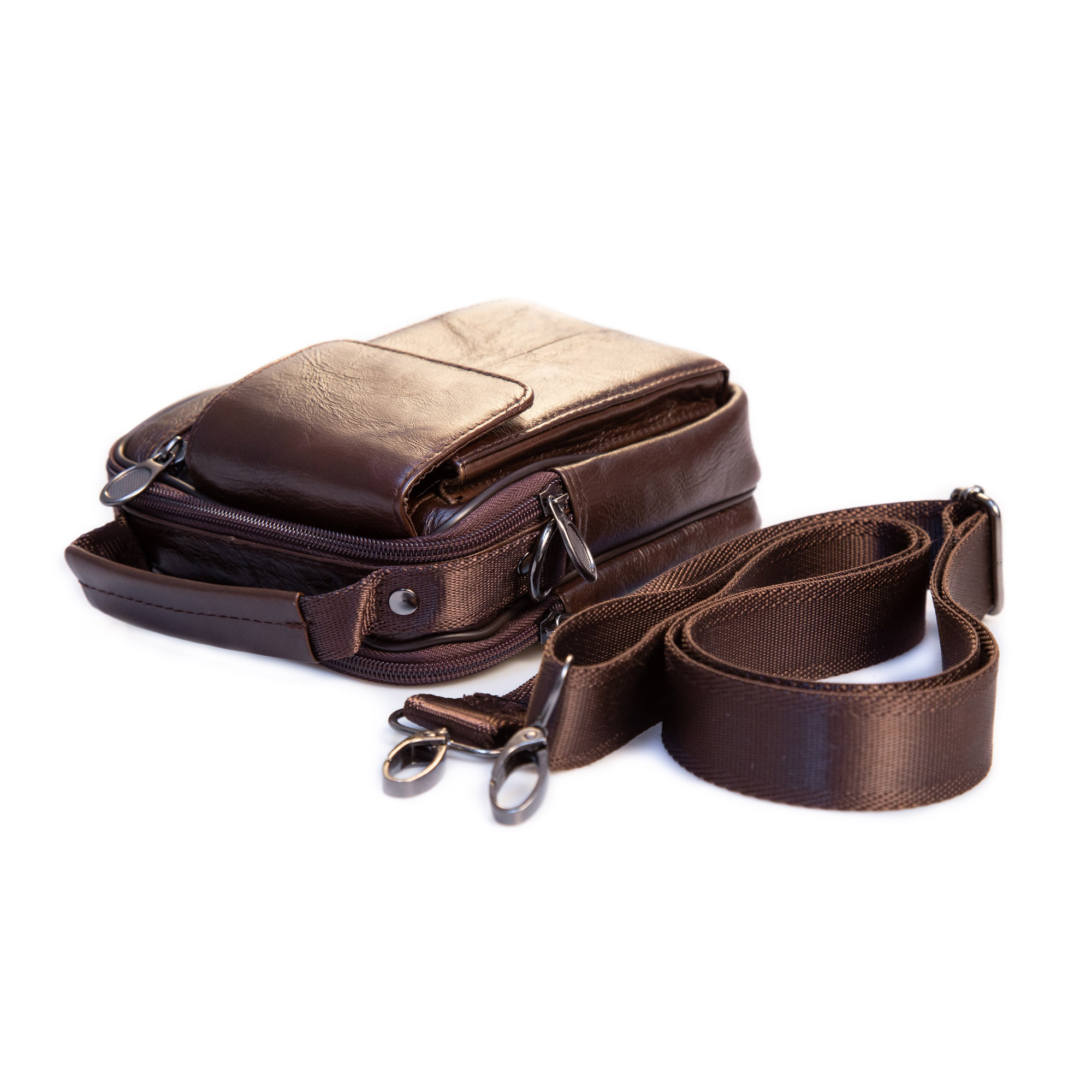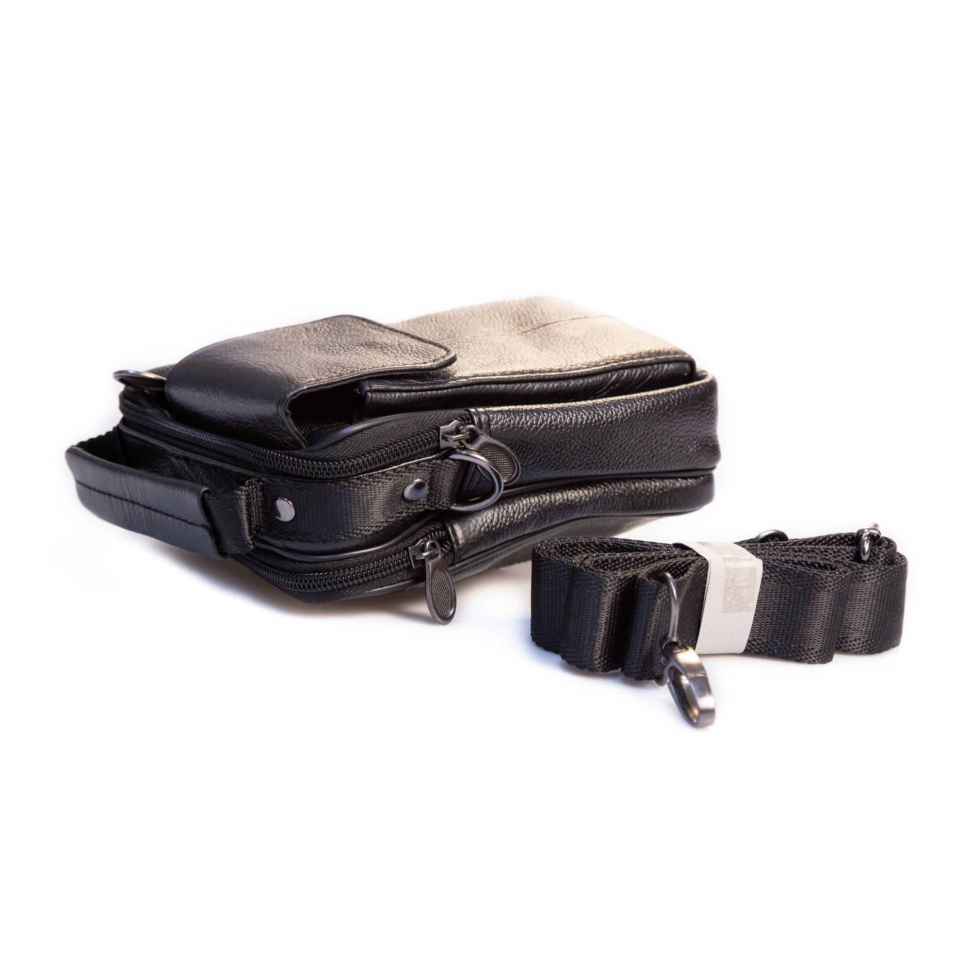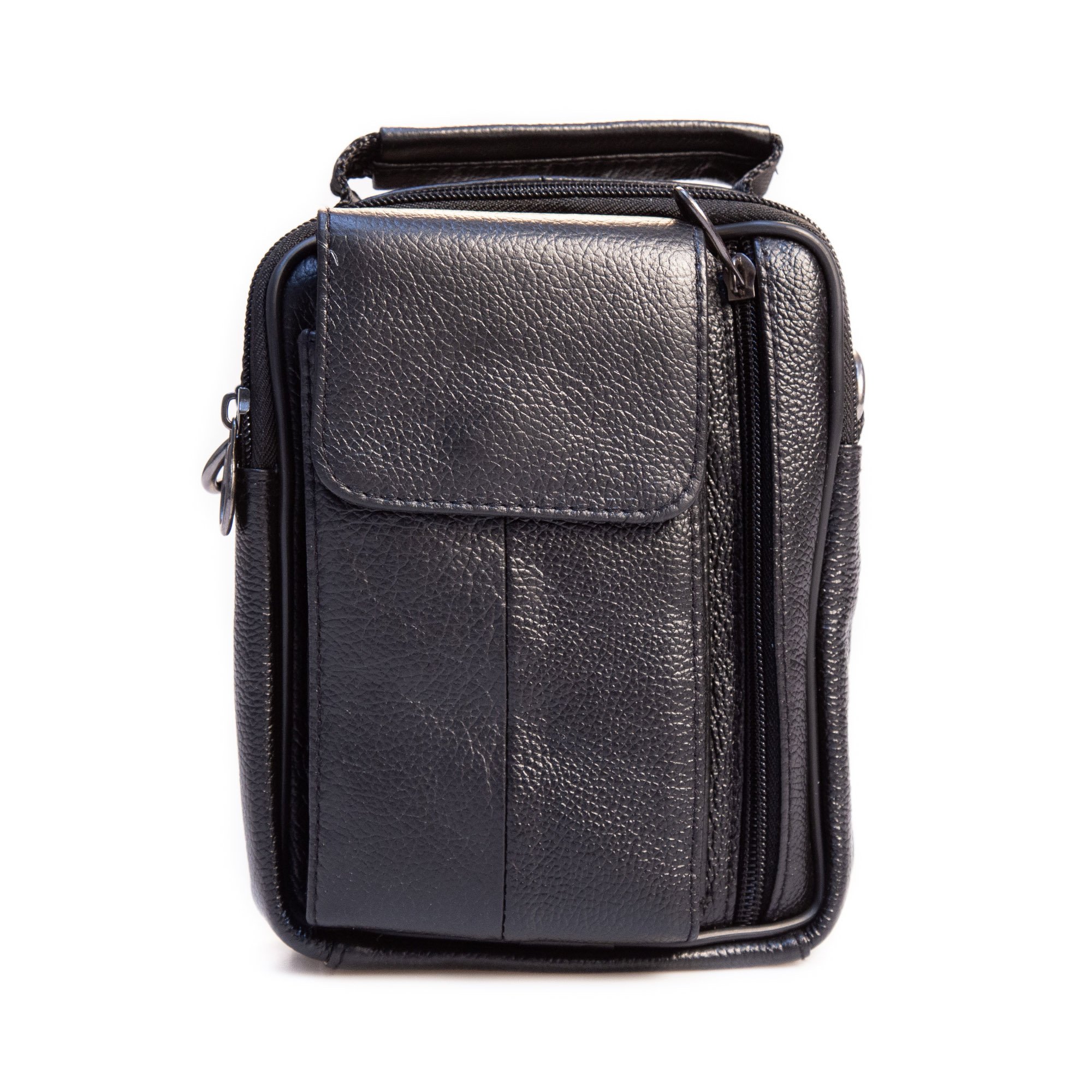 - Exterior: 1 compartiment special pentru smartphone, 1 compartiment in fata cu fermoar, suport de prindere pe curea